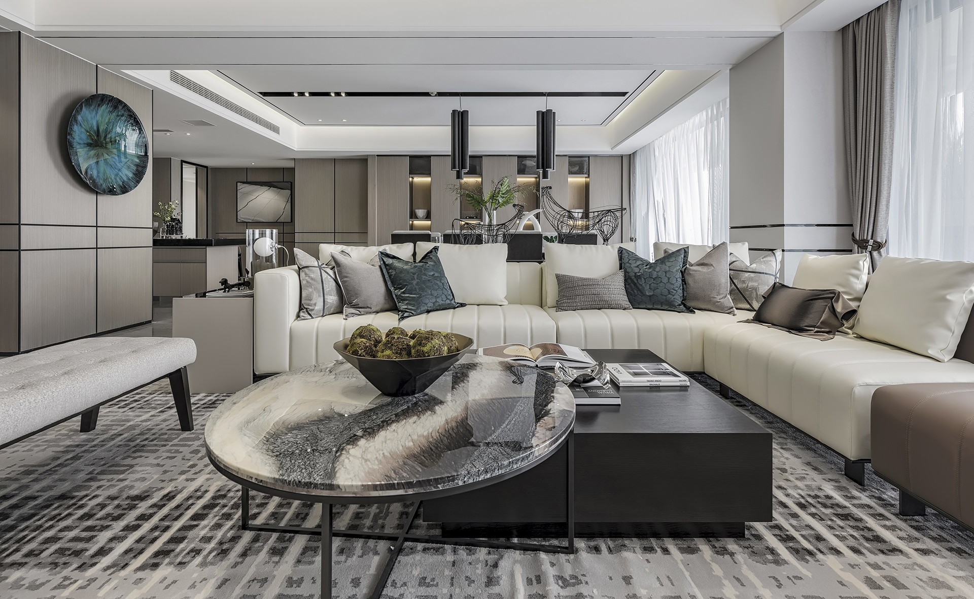 整体空间以米白、浅灰、咖色为主